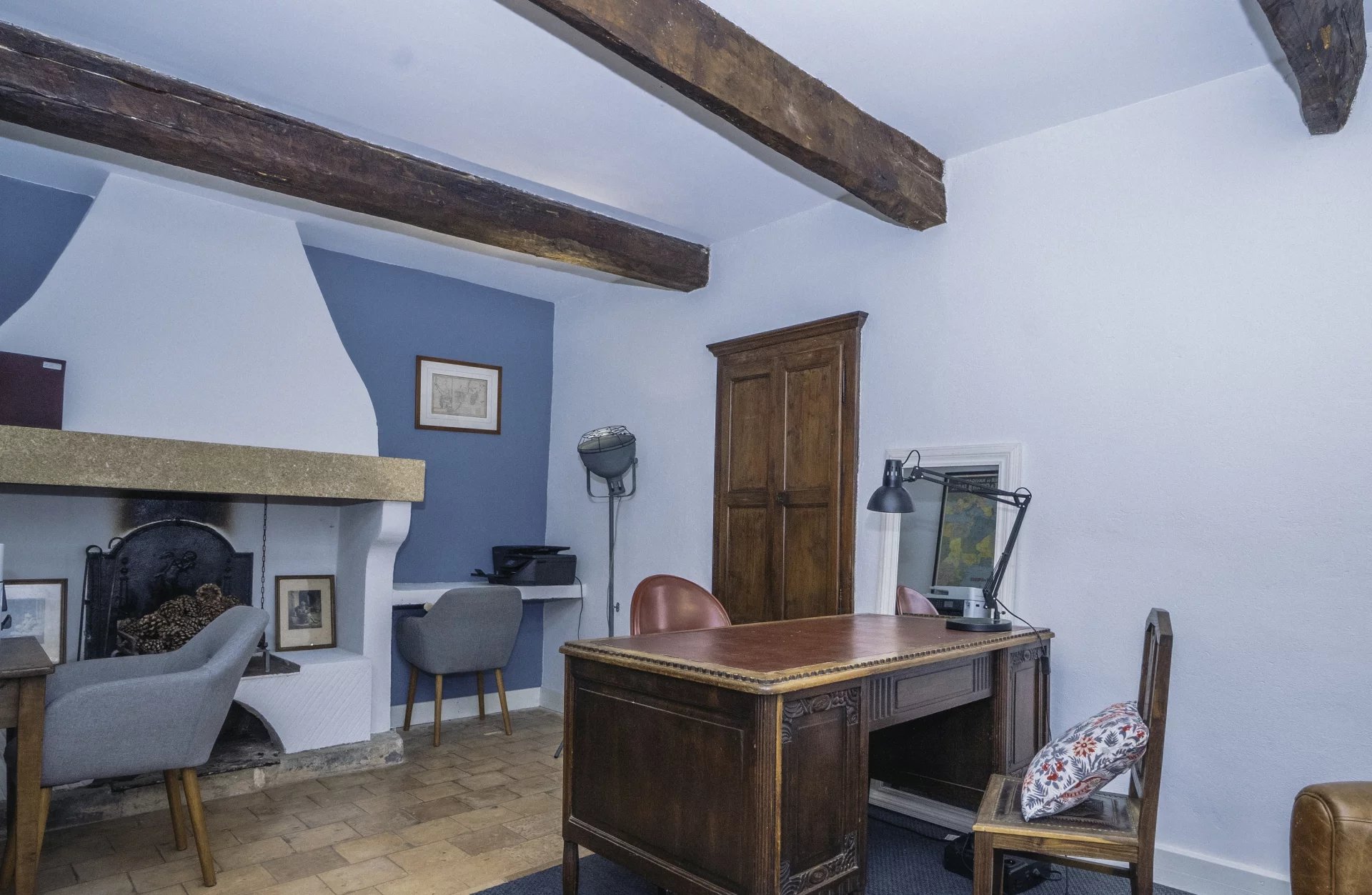 Le Salon : Un volume chaleureux où les poutres massives côtoient une décoration soignée et une cheminée magistrale.