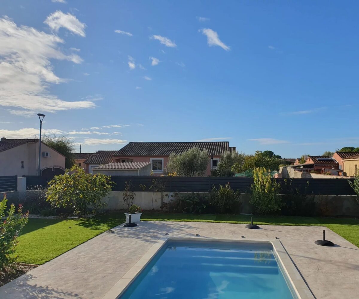 Extérieurs : Un jardin paysagé (refait en 2023) avec arrosage automatique sur forage. Une piscine en béton chauffée (6x3m) avec sa plage en béton imprimé.